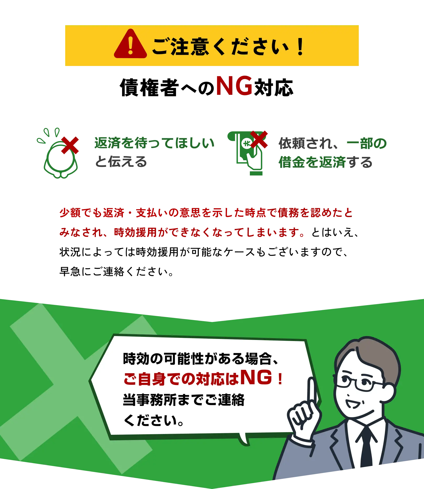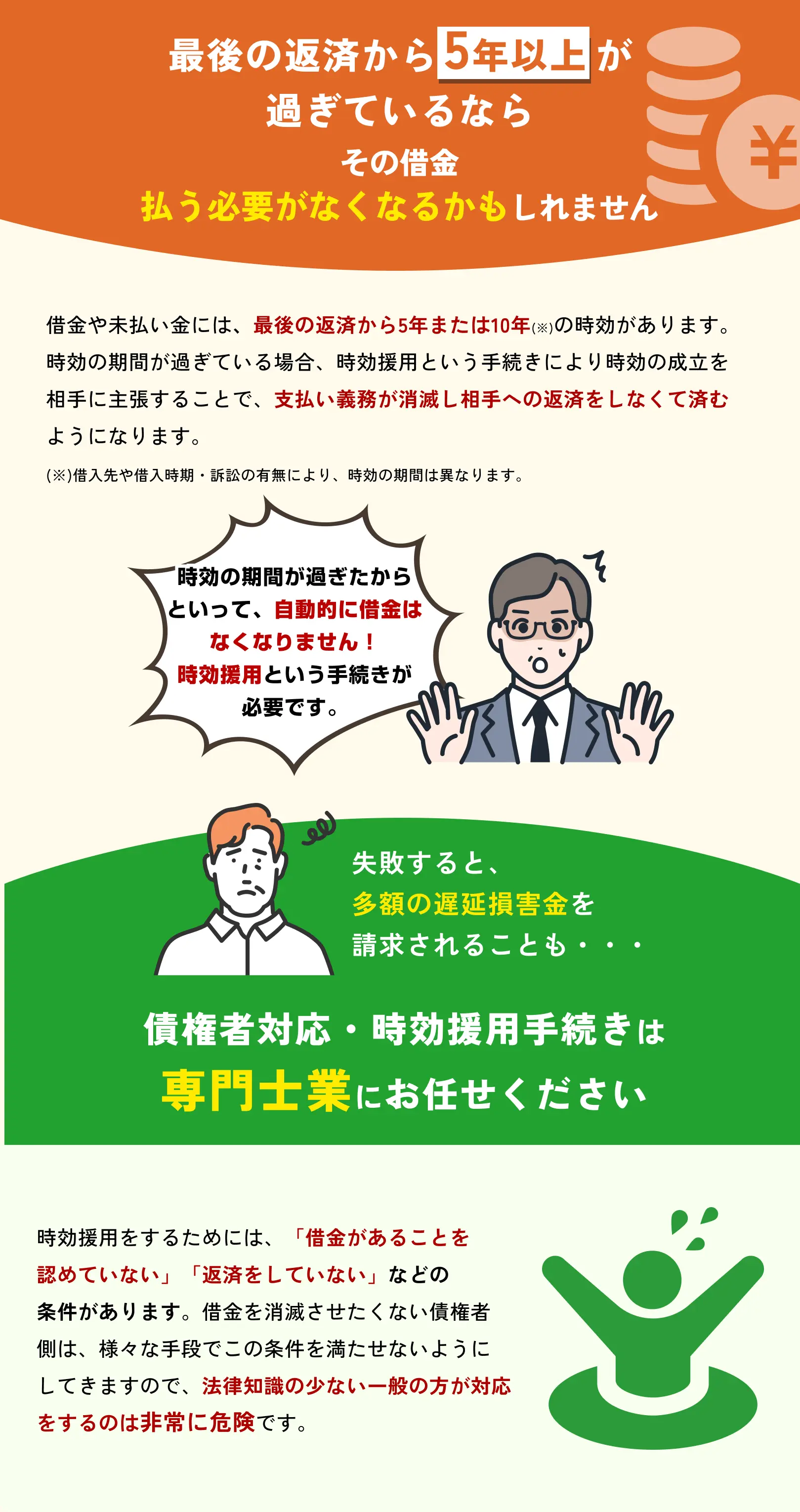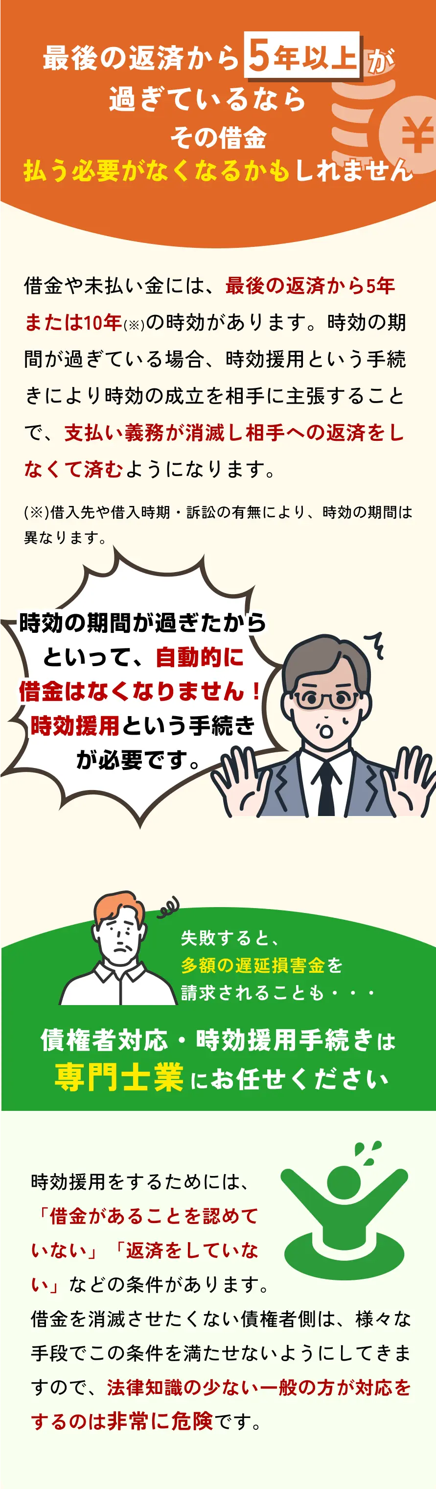 時効の援用手続きをして、成立しなければ支払い義務は消滅しません。手続きの代行を承りますので、当事務所までご相談ください。