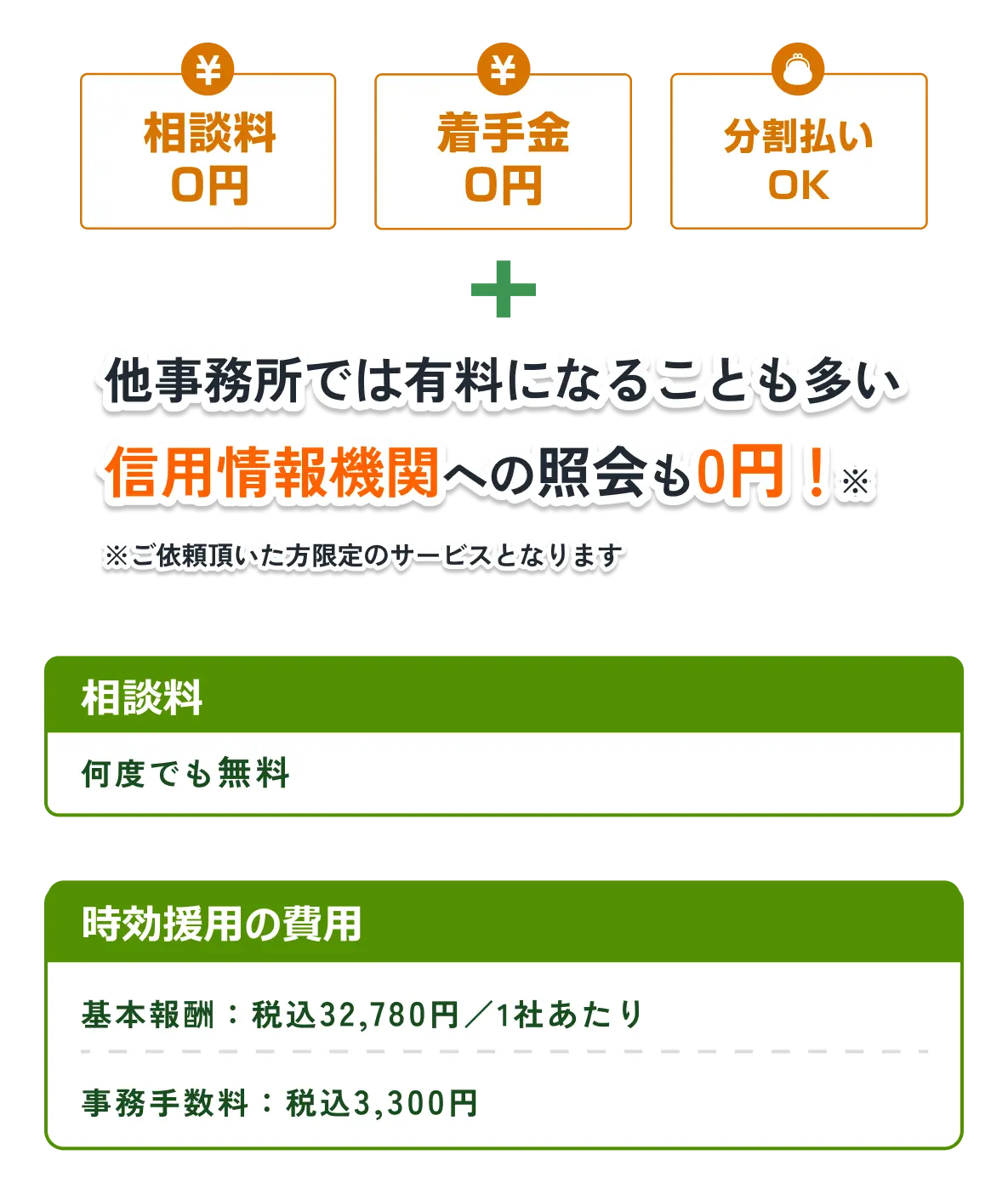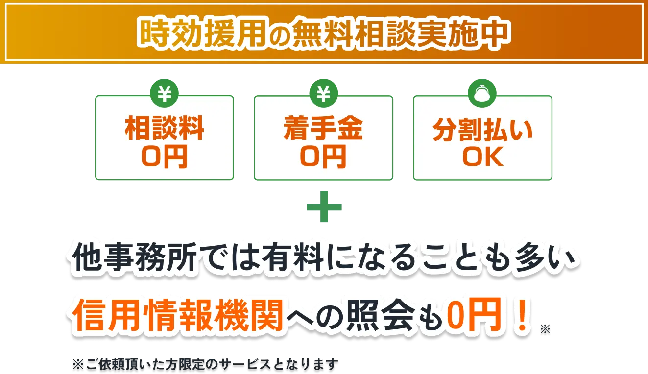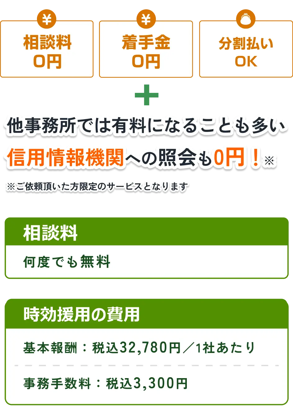 契約後、消滅時効が主張できるかを調査いたします。当事務所では、信用情報機関への照会は無料となっておりますので、ご安心ください。